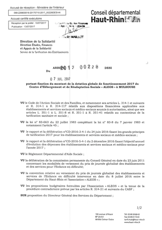 portant fixation du montant de la dotation globale de fonctionnement 2017 du centre d'hébergement et de réadaptation sociale "ALEOS" à MULHOUSE Resumé Pièces jointes ARRETE Assemblée : Non défini Date : 07/07/2017 Rapporteur : Non défini Collectivité : Conseil départemental du Haut-Rhin Direction : Non défini Service : Direction de la Solidarité Domaine : Dotations financières Commission :