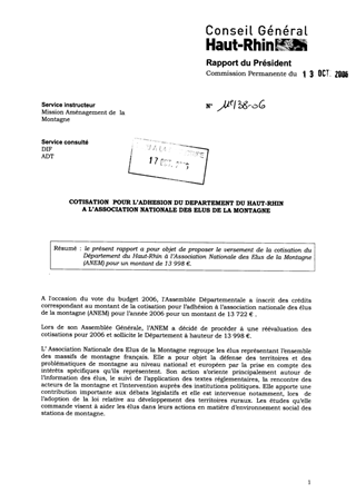 : le présent rapport a pour objet de proposer le versement de la cotisation du Département du Haut-Rhin à l’Association Nationale des Elus de la Montagne (ANEM) pour un montant de 13 998 €.