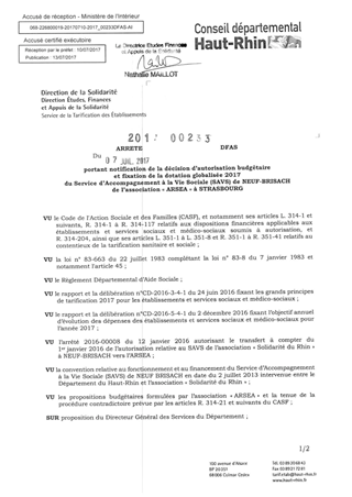 portant notification de la décision d'autorisation budgétaire et fixation de la dotation globalisée 2017 du service d'accompagnement à la vie sociale (SAVS) de NEUF-BRISACH de l'association "ARSEA" à STRASBOURG Resumé Pièces jointes ARRETE Assemblée : Non défini Date : 07/07/2017 Rapporteur : Non défini Collectivité : Conseil départemental du Haut-Rhin Direction : Non défini Service : Direction de la Solidarité Domaine : Dotations financières Commission :