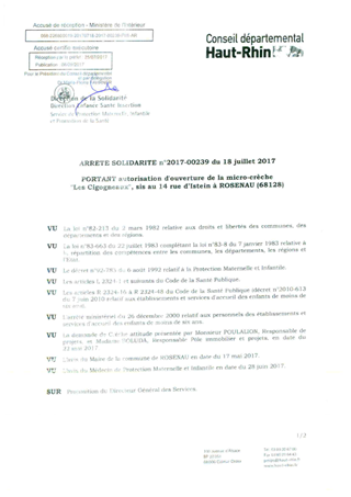 portant autorisation d'ouverture de la micro-crèche "Les Cigogneaux", sis au 14 rue d'Istein à ROSENAU (68128) Resumé Pièces jointes ARRETE Assemblée : Non défini Date : 18/07/2017 Rapporteur : Non défini Collectivité : Conseil départemental du Haut-Rhin Direction : Non défini Service : Direction de la Solidarité Domaine : Accueil d'enfants Commission :