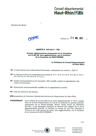 portant réglementation permanente de la circulation sur la RD 48, hors agglomération, sur le territoire de la commune de SOULTZEREN Resumé Pièces jointes ARRETE Assemblée : Non défini Date : 25/07/2017 Rapporteur : Non défini Collectivité : Conseil départemental du Haut-Rhin Direction : Non défini Service : Direction des Routes Domaine : Circulation Commission :