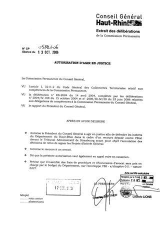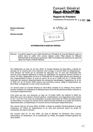 Le présent rapport a pour objet d’autoriser le Président du Conseil Général à agir en justice dans le cadre d’un recours déposé contre l’Etat devant le Tribunal Administratif de Strasbourg ayant pour objet l’annulation des décisions de refus de signer les Projets d’Intérêt Général.