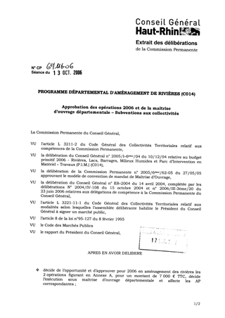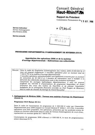 Dans le cadre du Programme d’aménagement des rivières 2006 (4 000 000 €), il vous est proposé d’approuver 2 nouvelles opérations pour un montant total de 7 000 € TTC et la maîtrise d’ouvrage départementale. 3 nouvelles opérations subventionnables sont également à inscrire pour un montant de subvention de 40 000 € et 3 dossiers de subventions sont à modifier à la demande des collectivités bénéficiaires suite à des évolutions techniques. Concernant les ouvrages hydrauliques départementaux, il vous est proposé d’affecter les 430 000 € d’autorisations de programme disponibles au projet d’annonce des crues des rivières du Haut-Rhin et de préciser l’imputation budgétaire de la contrepartie financière accordée au Club Vosgien de Masevaux dans le cadre du chantier du barrage du Grand Neuweiher