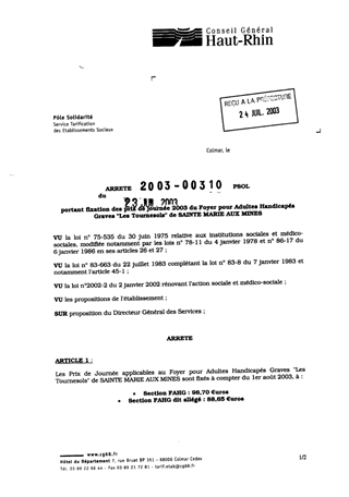 portant fixation des prix de journée 2003 du foyer pour adultes handicapés graves "Les Tournesols" de SAINTE MARIE AUX MINES. Resumé Pièces jointes ARRETE Assemblée : Non défini Date : 23/07/2003 Rapporteur : Non défini Collectivité : Conseil départemental du Haut-Rhin Direction : Non défini Service : Service de la Tarification des Etablissements Domaine : Prix de Journée Commission :
