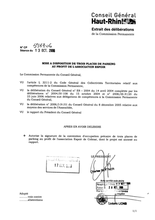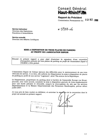 le présent rapport a pour objet d'autoriser la signature d'une convention d'occupation précaire de trois places de parking au profit de l'Association Espoir à COLMAR, à titre gratuit.