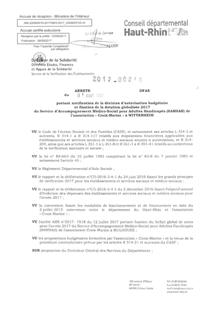 portant notification de la décision d'autorisation budgétaire et fixation de la dotation globale 2017 du service d'accompagnement médico-social pour adultes handicapés (SAMSAH) de l'association "Croix Marine" à WITTENHEIM Resumé Pièces jointes ARRETE Assemblée : Non défini Date : 01/08/2017 Rapporteur : Non défini Collectivité : Conseil départemental du Haut-Rhin Direction : Non défini Service : Direction de la Solidarité Domaine : Dotations financières Commission :