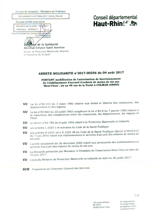 portant modification de l'autorisation de fonctionnement de l'établissement d'accueil d'enfants de moins de six ans "Bout'Chou", sis au 45 rue de la Fecht à COLMAR (68000) Resumé Pièces jointes ARRETE Assemblée : Non défini Date : 04/08/2017 Rapporteur : Non défini Collectivité : Conseil départemental du Haut-Rhin Direction : Non défini Service : Direction de la Solidarité Domaine : Accueil d'enfants Commission :
