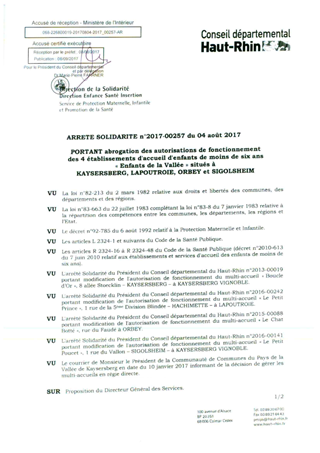 portant abrogation des autorisations de fonctionnement des 4 établissements d'accueil d'enfants de moins de six ans "Enfants de la Vallée" situés à KAYSERSBERG, LAPOUTROIE, ORBEY et SIGOLSHEIM Resumé Pièces jointes ARRETE Assemblée : Non défini Date : 04/08/2017 Rapporteur : Non défini Collectivité : Conseil départemental du Haut-Rhin Direction : Non défini Service : Direction de la Solidarité Domaine : Accueil d'enfants Commission :