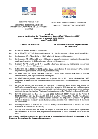 portant tarification de l'établissement éducatif et pédagogique (EEP) centre de la Ferme à RIEDISHEIM pour l'année 2017 Resumé Pièces jointes ARRETE Assemblée : Non défini Date : 08/08/2017 Rapporteur : Non défini Collectivité : Conseil départemental du Haut-Rhin Direction : Non défini Service : Direction de la Solidarité Domaine : Dotations financières Commission :