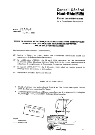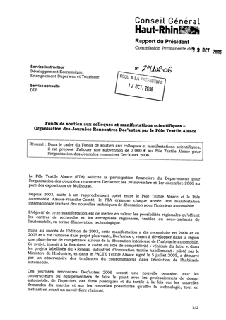 Dans le cadre du Fonds de soutien aux colloques et manifestations scientifiques, il est proposé d’allouer une subvention de 3 000 € au Pôle Textile Alsace pour l’organisation des Journées rencontres Dec’autex 2006.