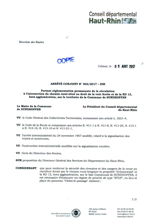 portant réglementation permanente de la circulation à l'intersection du chemin rural situé au droit de la voie ferrée et de la RD 13, hors agglomération, sur le territoire de la commune de SUNDHOFFEN Resumé Pièces jointes ARRETE Assemblée : Non défini Date : 08/08/2017 Rapporteur : Non défini Collectivité : Conseil départemental du Haut-Rhin Direction : Non défini Service : Direction des Routes Domaine : Circulation Commission :