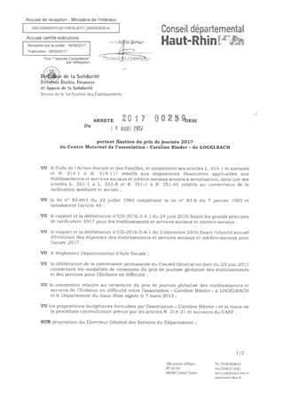 portant fixation du prix de journée 2017 du centre maternel de l'association "Caroline Binder" de LOGELBACH Resumé Pièces jointes ARRETE Assemblée : Non défini Date : 11/08/2017 Rapporteur : Non défini Collectivité : Conseil départemental du Haut-Rhin Direction : Non défini Service : Direction de la Solidarité Domaine : Prix de Journée Commission :