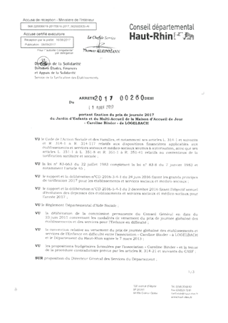portant fixation du prix de journée 2017 du Jardin d'Enfants et du multi-accueil de la maison d'accueil de jour "Caroline Binder" de LOGELBACH Resumé Pièces jointes ARRETE Assemblée : Non défini Date : 11/08/2017 Rapporteur : Non défini Collectivité : Conseil départemental du Haut-Rhin Direction : Non défini Service : Direction de la Solidarité Domaine : Prix de Journée Commission :