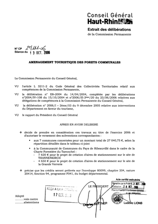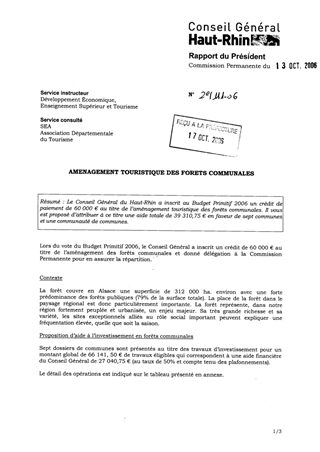 Le Conseil Général du Haut-Rhin a inscrit au Budget Primitif 2006 un crédit de paiement de 60 000 € au titre de l’aménagement touristique des forêts communales. Il vous est proposé d’attribuer à ce titre une aide totale de 39 310,75 € en faveur de sept communes et une communauté de communes