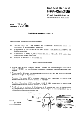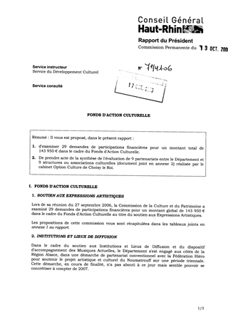 Il vous est proposé, dans le présent rapport : 1. d'examiner 29 demandes de participations financières pour un montant total de 143 950 € dans le cadre du Fonds d'Action Culturelle. 2. De prendre acte de la synthèse de l'évaluation de 9 partenariats entre le Département et 9 structures ou associations culturelles (document joint en annexe 2) réalisée par le cabinet Option Culture de Choisy le Roi.