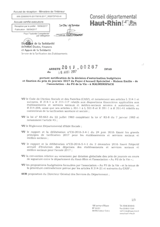 portant notification de la décision d'autorisation budgétaire et fixation du prix de journée 2017 du foyer d'accueil spécialisé "Maison Emilie" de l'association "Au Fil de la Vie" à MALMERSPACH Resumé Pièces jointes ARRETE Assemblée : Non défini Date : 16/08/2017 Rapporteur : Non défini Collectivité : Conseil départemental du Haut-Rhin Direction : Non défini Service : Direction de la Solidarité Domaine : Prix de Journée Commission :