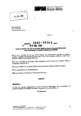 portant fixation du prix de journée 2003 du foyer d'accueil médicalisé "Les Tournesols" de SAINTE MARIE AUX MINES. Resumé Pièces jointes ARRETE Assemblée : Non défini Date : 23/07/2003 Rapporteur : Non défini Collectivité : Conseil départemental du Haut-Rhin Direction : Non défini Service : Service de la Tarification des Etablissements Domaine : Prix de Journée Commission :