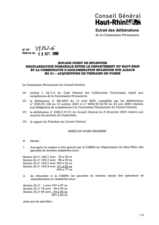 Rocade Ouest de Mulhouse. Régularisation domaniale entre le Département du Haut-Rhin et la Communauté d'agglomération Mulhouse Sud Alsace. BO51 Acquisitions de terrains de voirie