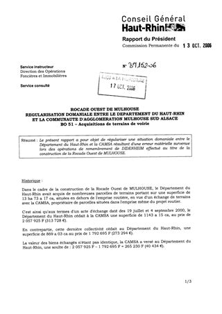 Le présent rapport a pour objet de régulariser une situation domaniale entre le Département du Haut Rhin et la CAMSA résultant d'une erreur matérielle survenue lors des opérations de remembrement de DIDENHEIM effectué au titre de la construction de la Rocade Ouest de MULHOUSE.