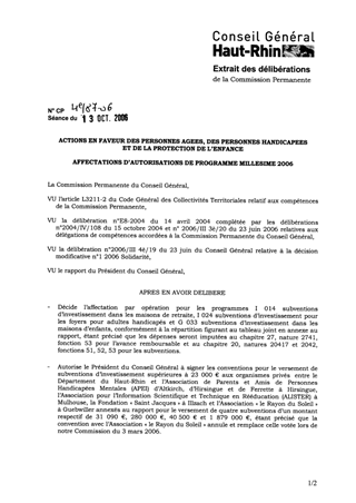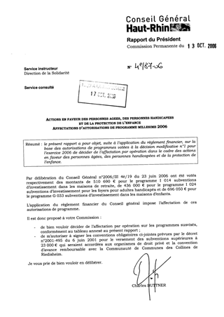 le présent rapport a pour objet, suite à l’application du règlement financier, sur la base des autorisations de programmes votées à la décision modificative n°1 pour l’exercice 2006 de décider de l’affectation par opération dans le cadre des actions en faveur des personnes âgées, des personnes handicapées et de la protection de l’enfance.