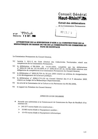 Il est proposé d’attribuer la somme de 389 912 € à la Communauté de Communes du Pays de Rouffach au titre de l'aide à la construction d'une médiathèque de bassin de vie.