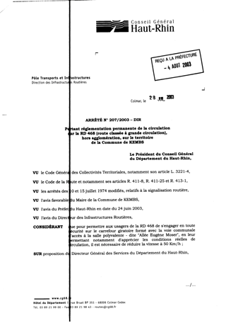 portant réglementation permanente de la circulation sur la RD 468 (route classée à grande circulation), hors agglomération, sur le territoire de la Commune de KEMBS. Resumé Pièces jointes ARRETE Assemblée : Non défini Date : 28/07/2003 Rapporteur : Non défini Collectivité : Conseil départemental du Haut-Rhin Direction : Non défini Service : Direction des Routes Domaine : Circulation Commission :