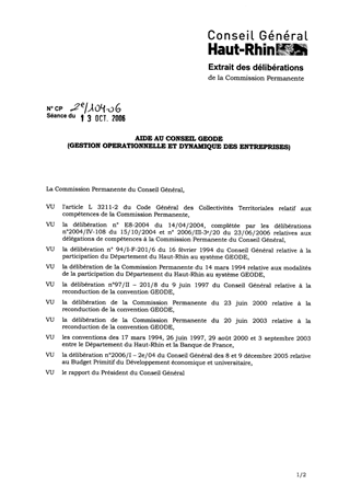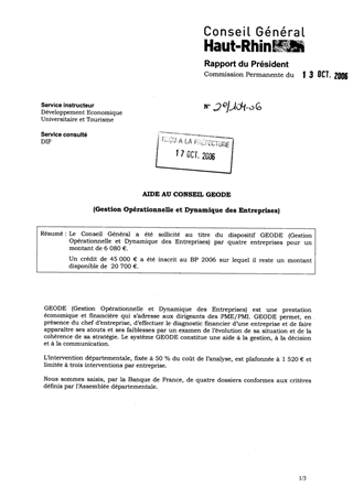 Le Conseil Général a été sollicité au titre du dispositif GEODE (Gestion Opérationnelle et Dynamique des Entreprises) par quatre entreprises pour un montant de 6 080 €. Un crédit de 45 000 € a été inscrit au BP 2006 sur lequel il reste un montant disponible de 20 700 €.