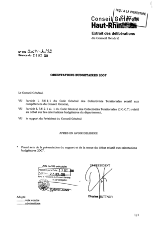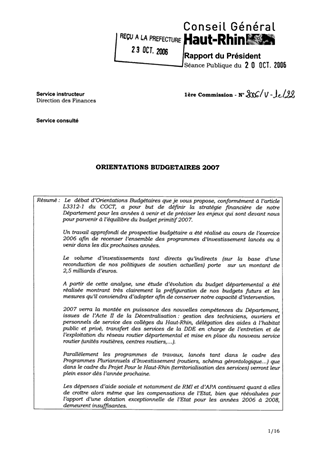 Le débat d’Orientations Budgétaires que je vous propose, conformément à l’article L3312-1 du CGCT, a pour but de définir la stratégie financière de notre Département pour les années à venir et de préciser les enjeux qui sont devant nous pour parvenir à l’équilibre du budget primitif 2007. Un travail approfondi de prospective budgétaire a été réalisé au cours de l’exercice 2006 afin de recenser l’ensemble des programmes d’investissement lancés ou à venir dans les dix prochaines années. Le volume d’investissements tant directs qu’indirects (sur la base d’une reconduction de nos politiques de soutien actuelles) porte sur un montant de 2,5 milliards d’euros. A partir de cette analyse, une étude d’évolution du budget départemental a été réalisée montrant très clairement la préfiguration de nos budgets futurs et les mesures qu’il conviendra d’adopter afin de conserver notre capacité d’intervention. 2007 verra la montée en puissance des nouvelles compétences du Département, issues de l’Acte II de la Décentralisation : gestion des techniciens, ouvriers et personnels de service des collèges du Haut-Rhin, délégation des aides à l’habitat public et privé, transfert des services de la DDE en charge de l’entretien et de l’exploitation du réseau routier départemental et mise en place du nouveau service routier (unités routières, centres routiers,…). Parallèlement les programmes de travaux, lancés tant dans le cadre des Programmes Pluriannuels d’Investissement (routiers, schéma gérontologique…) que dans le cadre du Projet Pour le Haut-Rhin (territorialisation des services) verront leur plein essor dès l’année prochaine. Les dépenses d’aide sociale et notamment de RMI et d’APA continuent quant à elles de croître alors même que les compensations de l’Etat, bien que réévaluées par l’apport d’une dotation exceptionnelle de l’Etat pour les années 2006 à 2008, demeurent insuffisantes. C’est dans ce contexte que prendra effet la réforme de la taxe professionnelle plafonnant le volume du produit de cette taxe à 3,5 % de la valeur ajoutée des entreprises. Son impact sera visible dès le prochain budget avec un premier manque à gagner estimé à 6,3 M€. A ce stade de nos travaux et des réflexions menées dans le cadre des commissions thématiques, le projet du budget pour 2007 avoisine les 738 M€ en recettes (sur la base d’un volume prévisionnel d’emprunt identique à celui du BP 2006), soit une progression de 1,32 % par rapport au BP 2006, et 807 M€ en dépenses (soit une hausse de 10,8 % par rapport au BP 2006) d’où une « impasse » de 69 M€ environ. Notre assemblée doit donc prendre un certain nombre de décisions pour présenter un BP 2007 en équilibre. Le bureau exécutif a identifié quelques pistes qui vous sont présentées ci-après. C’est sur ces bases qu’il conviendra d’affiner nos propositions tant en fonctionnement qu’en investissement. Cette situation confirme que la construction des budgets futurs des Départements sera de plus en plus complexe.