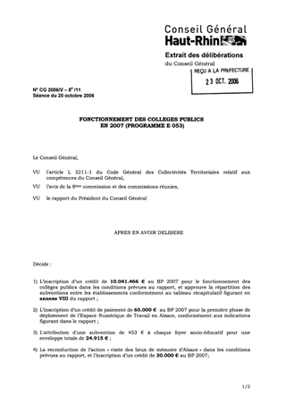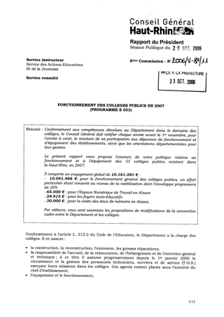 Conformément aux compétences dévolues au Département dans le domaine des collèges, le Conseil Général doit notifier chaque année avant le 1er novembre, pour l'année à venir, le montant de sa participation aux dépenses de fonctionnement et d'équipement des établissements, ainsi que les orientations départementales pour leur gestion. Le présent rapport vous propose l'examen de notre politique relative au fonctionnement et à l'équipement des 55 collèges publics existant dans le Haut Rhin, en 2007. Il comporte un engagement global de 10.161.381 € : - 10.041.466 €: pour le fonctionnement général des collèges publics, un effort particulier étant consenti au niveau de la viabilisation dont l’enveloppe progressera de 20% - 65.000 € : pour l’Espace Numérique de Travail en Alsace - 24.915 € : pour les foyers socio-éducatifs - 30.000 € : pour la visite des lieux de mémoire en Alsace. Par ailleurs, vous sont soumises les propositions de modifications de la convention cadre entre le Département et les collèges.