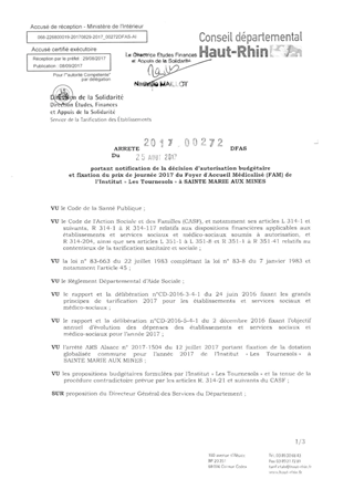 portant notification de la décision d'autorisation budgétaire et fixation du prix de journée 2017 du foyer d'accueil médicalisé (FAM) de l'institut "Les Tournesols" à SAINTE MARIE AUX MINES Resumé Pièces jointes ARRETE Assemblée : Non défini Date : 25/08/2017 Rapporteur : Non défini Collectivité : Conseil départemental du Haut-Rhin Direction : Non défini Service : Direction de la Solidarité Domaine : Prix de Journée Commission :