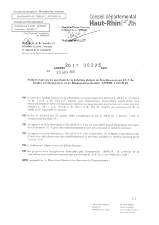 portant fixation du montant de la dotation globale de fonctionnement 2017 du centre d'hébergement et de réadaptation sociale "APPUIS" à COLMAR Resumé Pièces jointes ARRETE Assemblée : Non défini Date : 25/08/2017 Rapporteur : Non défini Collectivité : Conseil départemental du Haut-Rhin Direction : Non défini Service : Direction de la Solidarité Domaine : Dotations financières Commission :