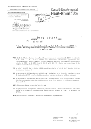 portant fixation du montant de la dotation globale de fonctionnement 2017 du centre d'hébergement et de réadaptation sociale "Solidarités Femmes 68" à SAINT-LOUIS Resumé Pièces jointes ARRETE Assemblée : Non défini Date : 25/08/2017 Rapporteur : Non défini Collectivité : Conseil départemental du Haut-Rhin Direction : Non défini Service : Direction de la Solidarité Domaine : Dotations financières Commission :