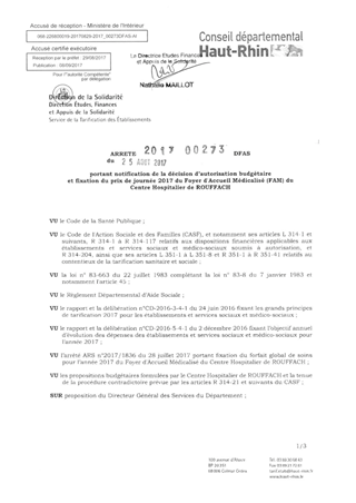 portant notification de la décision d'autorisation budgétaire et fixation du prix de journée 2017 du foyer d'accueil médicalisé (FAM) du centre hospitalier de ROUFFACH Resumé Pièces jointes ARRETE Assemblée : Non défini Date : 25/08/2017 Rapporteur : Non défini Collectivité : Conseil départemental du Haut-Rhin Direction : Non défini Service : Direction de la Solidarité Domaine : Prix de Journée Commission :