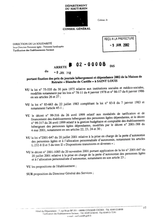 Portant fixation des prix de journée hébergement et dépendance 2002 de la Maison de Retraite "Blanche de Castille" à SAINT LOUIS Resumé Pièces jointes ARRETE Assemblée : Non défini Date : 08/01/2002 Rapporteur : Non défini Collectivité : Conseil départemental du Haut-Rhin Direction : Non défini Service : Direction de la Solidarité Domaine : Prix de Journée Commission :