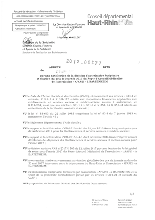 portant notification de la décision d'autorisation budgétaire et fixation du prix de journée 2017 du foyer d'accueil médicalisé de l'association "AFAPEI" à BARTENHEIM Resumé Pièces jointes ARRETE Assemblée : Non défini Date : 28/08/2017 Rapporteur : Non défini Collectivité : Conseil départemental du Haut-Rhin Direction : Non défini Service : Direction de la Solidarité Domaine : Prix de Journée Commission :