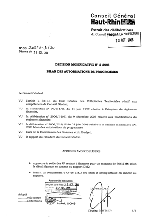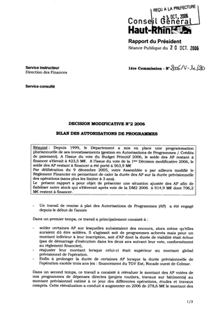 Depuis 1999, le Département a mis en place une programmation pluriannuelle de ses investissements (gestion en Autorisations de Programmes / Crédits de paiement). A l’issue du vote du Budget Primitif 2006, le solde des AP restant à financer s’élevait à 423,5 M€. A l’issue du vote de la 1ère Décision modificative 2006, le solde des AP restant à financer a été porté à 563,9 M€ Par délibération du 9 décembre 2005, votre Assemblée a par ailleurs modifié le Règlement Financier en permettant de caler la durée des AP sur la durée prévisionnelle des opérations (sans plus les limiter à 3 ans). Le présent rapport a pour objet de présenter une situation ajustée des AP afin de fiabiliser notre stock qui s’élèverait après vote de la DM2 2006 à 914,9 M€ dont 706,2 M€ restent à financer.