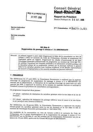 Le présent rapport a pour objet d’approuver le bilan de la concertation au titre de l’article L.300-2 et suivants du Code de l’Urbanisme, d’arrêter le programme de l’opération décrit au rapport, d’approuver les études d’avant-projet et de fixer l’enveloppe financière prévisionnelle du programme au montant de 19,93 M€ TTC, de solliciter l’ouverture de l’enquête préalable à la déclaration d’utilité publique de la deuxième phase de ce programme, portant sur le passage inférieur à gabarit réduit et le carrefour giratoire avec l'avenue d'Altkirch, et de décider expressément de recourir à l’expropriation si les accords amiables ne peuvent intervenir.