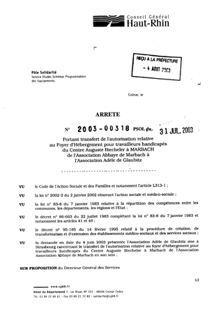portant transfert de l'autorisation relative au foyer d'hébergement pour travailleurs handicapés du centre Auguste Biechler à MARBACH de l'association Abbaye de Marbach à l'association Adèle de Glaubitz. Resumé Pièces jointes ARRETE Assemblée : Non défini Date : 31/07/2003 Rapporteur : Non défini Collectivité : Conseil départemental du Haut-Rhin Direction : Non défini Service : Service études, schémas et programmation des équipements Domaine : Autres (non classés) Commission :