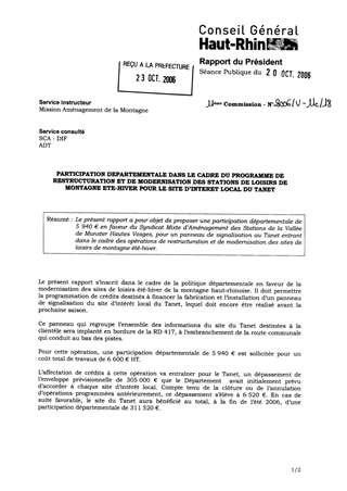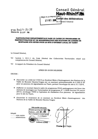 Le présent rapport a pour objet de proposer une participation départementale de 5 940 € en faveur du Syndicat Mixte d’Aménagement des Stations de la Vallée de Munster Hautes Vosges, pour un panneau de signalisation au Tanet entrant dans le cadre des opérations de restructuration et de modernisation des sites de loisirs de montagne été-hiver.