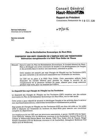 Dans le cadre du Plan de Revitalisation Economique, le Conseil Général du Haut-Rhin a développé une action innovante de soutien et de développement de l’emploi et des activités dans le secteur non-marchand, associatif et public. Cette mission est assurée par sept Chargés de l’Emploi sur les Territoires (CET) qui sont rattachés à six structures associatives sur l’ensemble du territoire. Un CET est en place à la PAIO Thur Doller. Cette association sollicite l’aide financière du Conseil Général pour prendre en charge le surcoût lié au remplacement de la personne titulaire du poste, absente pour congé maternité pendant sept mois, pour un montant de 9 000 €.