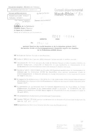 portant fixation des tarifs horaires et de la dotation globale 2017 du service d'aide et d'accompagement à domicile auprès des familles de la fédération ADMR Alsace Resumé Pièces jointes ARRETE Assemblée : Non défini Date : 15/09/2017 Rapporteur : Non défini Collectivité : Conseil départemental du Haut-Rhin Direction : Non défini Service : Direction de la Solidarité Domaine : Dotations financières Commission :