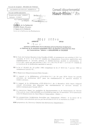 portant notification de la décision d'autorisation budgétaire et fixation de la dotation globalisée 2017 du service d'accueil de jour de l'association "Alister" à MULHOUSE et COLMAR Resumé Pièces jointes ARRETE Assemblée : Non défini Date : 15/09/2017 Rapporteur : Non défini Collectivité : Conseil départemental du Haut-Rhin Direction : Non défini Service : Direction de la Solidarité Domaine : Dotations financières Commission :