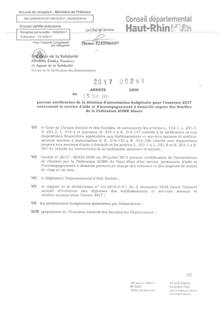 portant notification de la décision d'autorisation budgétaire pour l'exercice 2017 concernant le service d'aide et d'accompagnement à domicile auprès des familles de la fédération ADMR Alsace Resumé Pièces jointes ARRETE Assemblée : Non défini Date : 15/09/2017 Rapporteur : Non défini Collectivité : Conseil départemental du Haut-Rhin Direction : Non défini Service : Direction de la Solidarité Domaine : Dotations financières Commission :