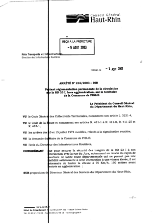 portant réglementation permanente de la circulation sur la RD 23 I, hors agglomération, sur le territoire de la commune de FISLIS. Resumé Pièces jointes ARRETE Assemblée : Non défini Date : 01/08/2003 Rapporteur : Non défini Collectivité : Conseil départemental du Haut-Rhin Direction : Non défini Service : Direction des Routes Domaine : Logement de service Commission :