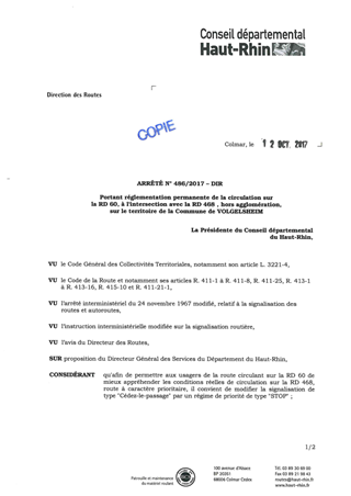 portant réglementation permanente de la circulation sur la RD 60, à l'intersection avec la RD 468, hors agglomération, sur le territoire de la commune de VOLGELSHEIM Resumé Pièces jointes ARRETE Assemblée : Non défini Date : 12/10/2017 Rapporteur : Non défini Collectivité : Conseil départemental du Haut-Rhin Direction : Non défini Service : Direction des Routes Domaine : Circulation Commission :
