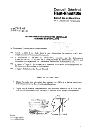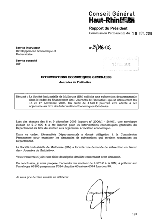 La Société Industrielle de Mulhouse (SIM) sollicite une subvention départementale dans le cadre du financement des « Journées de l’Initiative » qui se dérouleront les 16 et 17 novembre 2006. Un crédit de 4 570 € pourrait être affecté à cet organisme au titre des Interventions Economiques Générales.