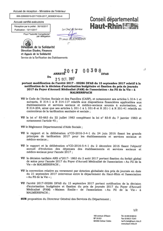 portant modification de l'arrêté 2017-00286-DFAS du 15 septembre 2017 relatif à la notification de la décision d'autorisation budgétaire et fixation du prix de journée 2017 du foyer d'accueil médicalisé (FAM) de l'association "Au Fil de la Vie" à MALMERSP