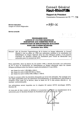 Afin de favoriser l’apprentissage de la lecture en langue allemande, le Conseil Général a mis en place en 1996 une subvention incitative à la constitution de bibliothèques en langue régionale dans les sites bilingues publics. Il est proposé d'attribuer au Syndicat scolaire du Soultzbach pour l’école de Mortzwiller une subvention pour un montant de 500 €.