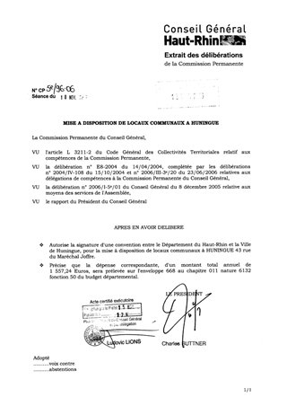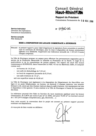 le présent rapport a pour objet d'approuver la signature d'une convention à conclure avec la commune de Huningue, pour la mise à disposition de locaux communaux affectés à la Solidarité, moyennant une redevance annuelle de 1 557,24 € toutes charges comprises.