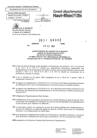 portant fixation du montant de la dotation globale de fonctionnement 2017 du service d'action éducative en milieu ouvert avec hébergement périodique ou exceptionnel de la "Fondation d'Auteuil" de COLMAR Resumé Pièces jointes ARRETE Assemblée : Non défini Date : 30/10/2017 Rapporteur : Non défini Collectivité : Conseil départemental du Haut-Rhin Direction : Non défini Service : Direction de la Solidarité Domaine : Dotations financières Commission :